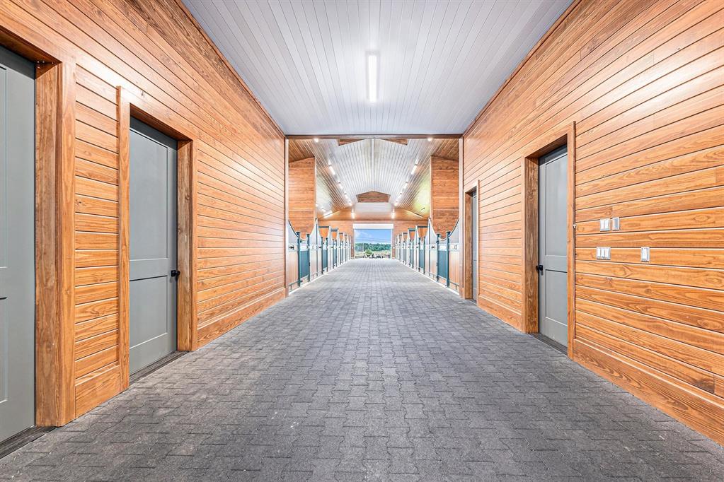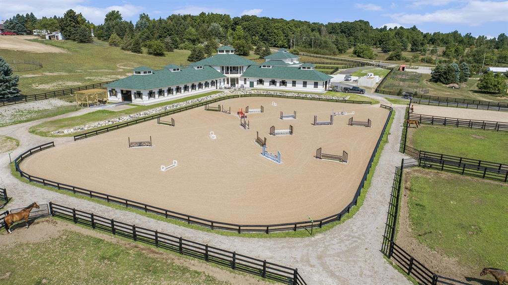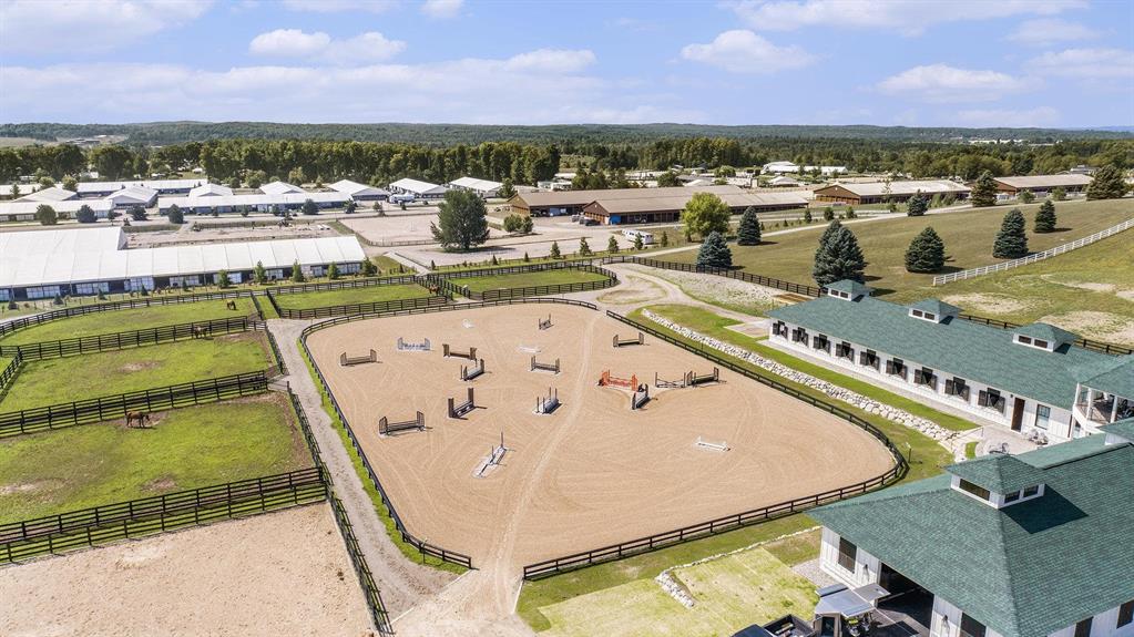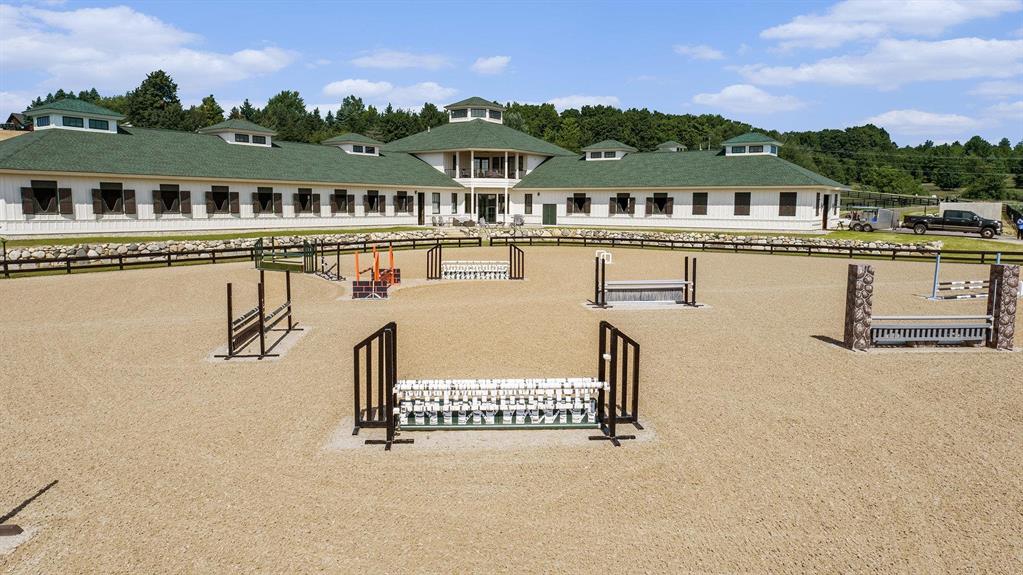 Pinecone Farm is a luxurious 6-acre gated equestrian estate located adjacent to Flintfields Horse Park, home of the Traverse City Horse Shows. Completed in 2024 with no expense spared, the property was nationally recognized in the Best in American Living Awards for Best Accessory Dwelling Unit-highlighting the exceptional quality and thoughtful design throughout. Designed by equestrians for functionality and comfort, the 11,875 sq ft main barn features 24 BarnWalker stalls with bamboo walls, stainless top rails, and individual water fillers. The stalls are divided into two wings, each with its own tack room and storage-ideal for private use or rental. The barn includes 4 wash stalls, 4 grooming stalls, custom cabinetry, a spacious viewing lounge with half bath, bar area, refrigerator, and covered porch. Additional amenities include a laundry/break room, integrated tack storage, and hay/feed rooms with exterior access. Above the main barn is a private 4-bedroom, 3.5-bath owners residence with a private elevator and dumbwaiter. Enjoy panoramic views over the riding ring and countryside from the primary suite and covered viewing deck. The auxiliary barn offers 4-bedroom, 2-bath staff accommodations, extra-height garage doors for RVs, a golf cart charging wall, and wiring for temporary stalls. Outside amenities include a 250x150 GeoFiber riding ring, GeoFiber longeing ring, irrigated paddocks with underground drainage, and 2 RV hookups. The property features two gated entrances from Brackett Road and Arabian Lane, plus an additional gate for horse and golf cart access to the showgrounds. This is a rare opportunity to own a turnkey, award-winning equestrian property in one of the countrys top show destinations. |